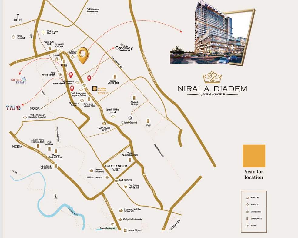 Nirala Diadem is a new mixed-use commercial project offering retail shops, office spaces, and 1 RK studio apartments in Sector 10, Greater Noida West. Spread across 2.75 acres, the development features a three-side open plot with modern design and lifestyle-focused planning. The project includes 556 studio units ranging from 565 to 810 sq. ft., ideal for investment and compact living. Key amenities include a rooftop infinity pool, clubhouse, mini theatre, gym, co-working spaces, meditation area, amphitheatre, kids’ play zone, cafeteria, and landscaped gardens. Strategically located on a 130-meter wide road, Nirala Diadem enjoys excellent connectivity to Gaur City Mall, schools, hospitals, railway station, and upcoming airports. RERA: UP-RERA-PRJ-825-497/11 Launch: November 2025
